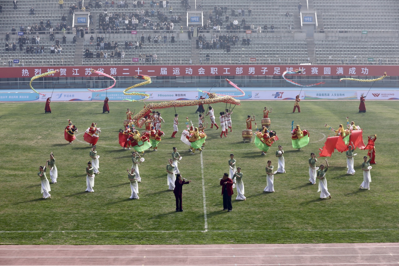 开幕式发轫,一场会通扬州原土特质与员工活力的暖场节目《龙腾好方位》燃烧全场氛围。节目以三龙四狮、江都吴桥社火赛马灯、仪征彩带龙等非遗扮演领衔,搭配经典小调改编曲、国风说唱、啦啦操等多元形态,员工队列同台演绎,尽显扬州文化底蕴与新时期员工的快活风貌。