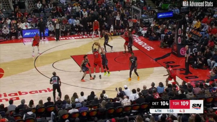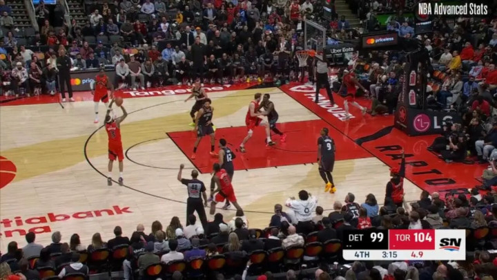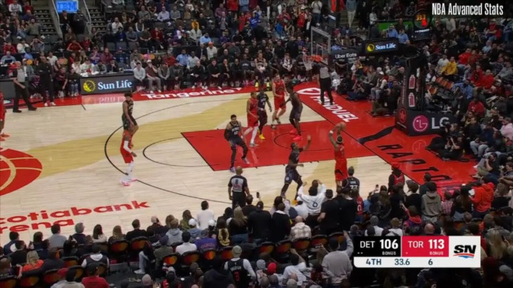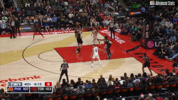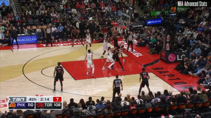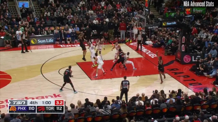 ——剩下31.7秒前,接巴雷特传球,底角大空位三分射中,这一球事后猛龙衰退至10分,杀死悬念