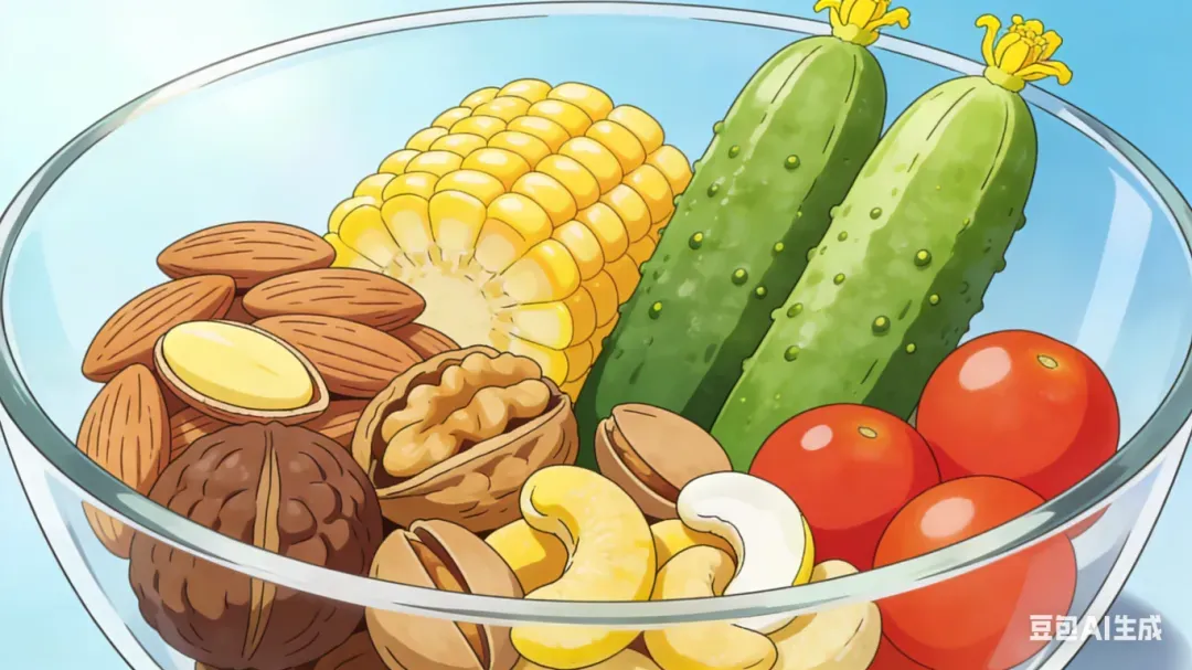 零食类:用自然食品代替加工品 保举:原味坚果(杏仁、核桃、腰果等)、水煮玉米(甜玉米)、黄瓜/小番茄。 情理:原味坚果富含健康脂肪和植物卵白,有助于增强饱腹感,每天吃一小把即可(10~15克,约8~10颗杏仁);一根中等大小的甜玉米(约150g可食部),GI≈55,属于低至中等血糖负荷。黄瓜GI=15,小番茄GI=30,均为典型低GI蔬菜,升糖爽直。